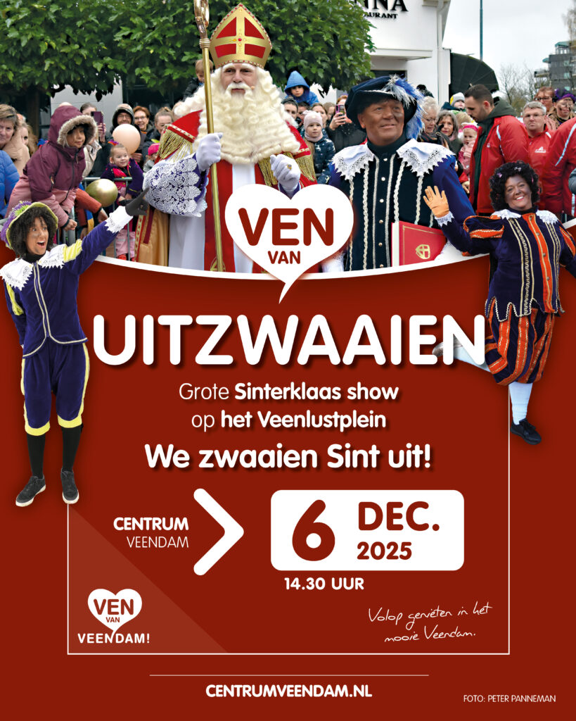 Na weken vol vrolijkheid, pepernoten en pakjes komt het onvermijdelijke moment toch aan: Sinterklaas neemt afscheid van Veendam. Op zaterdag 6 december om 14:30 uur vindt daarom een feestelijke Sinterklaas Uitzwaaitocht plaats, (Veenlustplein) waarbij jong en oud de goedheiligman komen uitzwaaien en hem een goede terugreis naar Spanje te wensen.